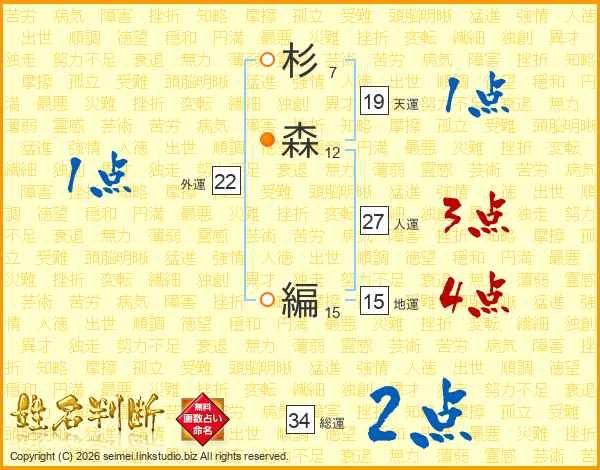 杉(7画)森(12画) 編(15画)