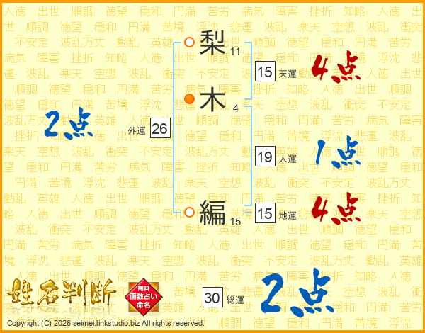 生活面を象徴する運勢です。外部から受ける影響力を表し、結婚運、家庭運や職場、環境への順応性を表します。総運から人運を引いた画数。姓や名が1文字の場合を除く。