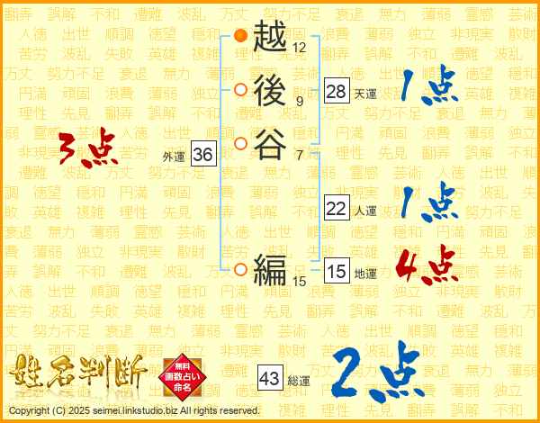 生活面を象徴する運勢です。外部から受ける影響力を表し、結婚運、家庭運や職場、環境への順応性を表します。総運から人運を引いた画数。姓や名が1文字の場合を除く。