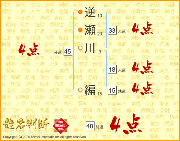 逆(10画)瀬(20画)川(3画) 編(15画)