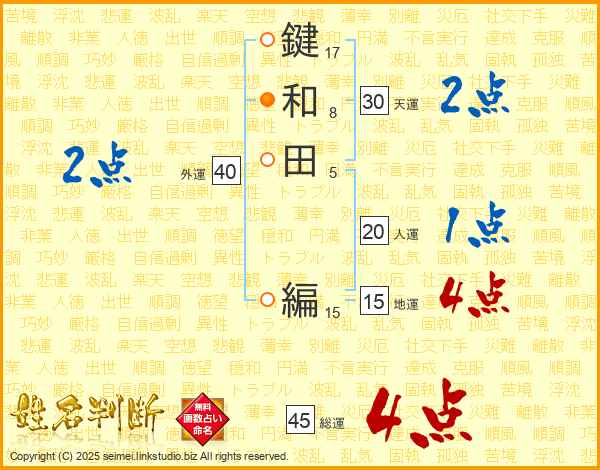 生活面を象徴する運勢です。外部から受ける影響力を表し、結婚運、家庭運や職場、環境への順応性を表します。総運から人運を引いた画数。姓や名が1文字の場合を除く。