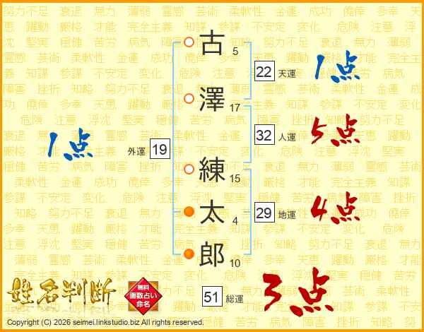 古(5画)澤(17画) 練(15画)太(4画)郎(10画)