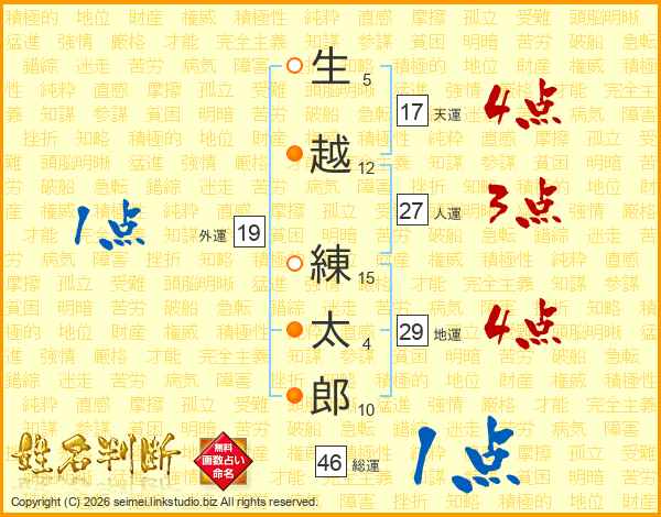 生(5画)越(12画) 練(15画)太(4画)郎(10画)