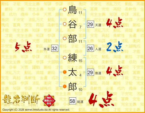 鳥(11画)谷(7画)部(11画) 練(15画)太(4画)郎(10画)