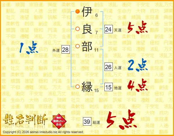 家系が持つ宿命的な運勢を表します。祖先から受け継いだ苗字ですので自分の力が及びません。家柄を象徴します。苗字の合計画数。