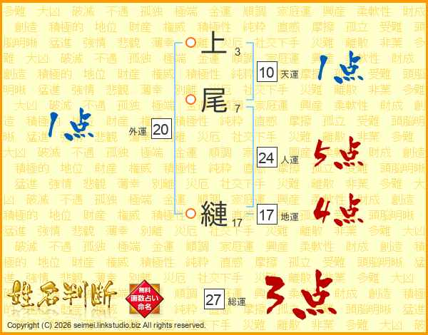 生活面を象徴する運勢です。外部から受ける影響力を表し、結婚運、家庭運や職場、環境への順応性を表します。総運から人運を引いた画数。姓や名が1文字の場合を除く。