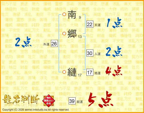 生活面を象徴する運勢です。外部から受ける影響力を表し、結婚運、家庭運や職場、環境への順応性を表します。総運から人運を引いた画数。姓や名が1文字の場合を除く。