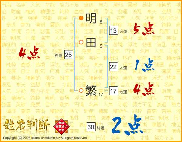 あなたの人生を表す1番重要な運勢です。生涯を通じて影響する総合運となり、主に50歳以降の晩年期に影響を及ぼします。苗字と名前の合計画数。