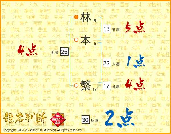 あなたの人生を表す1番重要な運勢です。生涯を通じて影響する総合運となり、主に50歳以降の晩年期に影響を及ぼします。苗字と名前の合計画数。