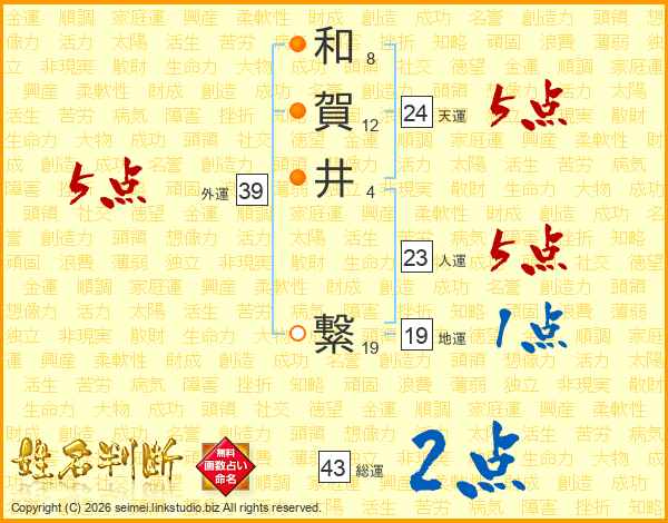 和賀井繋さんの人運は23画の5点!