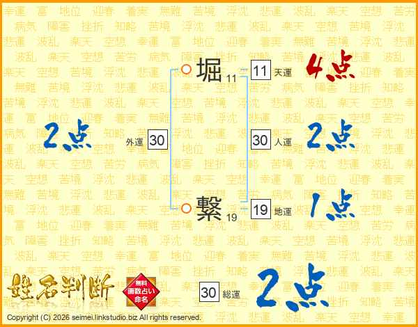 生活面を象徴する運勢です。外部から受ける影響力を表し、結婚運、家庭運や職場、環境への順応性を表します。総運から人運を引いた画数。姓や名が1文字の場合を除く。