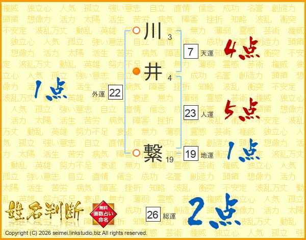 生活面を象徴する運勢です。外部から受ける影響力を表し、結婚運、家庭運や職場、環境への順応性を表します。総運から人運を引いた画数。姓や名が1文字の場合を除く。