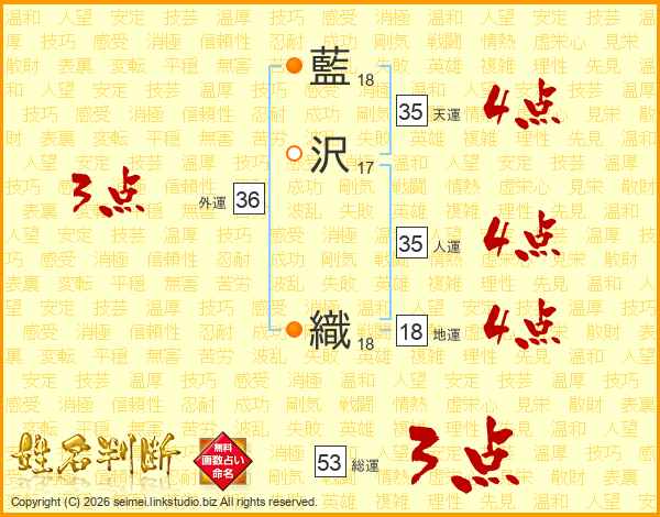 藍(18画)沢(17画) 織(18画)