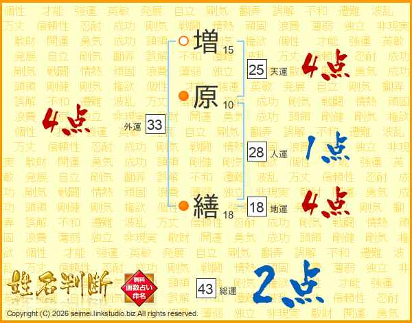 家系が持つ宿命的な運勢を表します。祖先から受け継いだ苗字ですので自分の力が及びません。家柄を象徴します。苗字の合計画数。