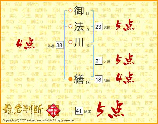 生活面を象徴する運勢です。外部から受ける影響力を表し、結婚運、家庭運や職場、環境への順応性を表します。総運から人運を引いた画数。姓や名が1文字の場合を除く。