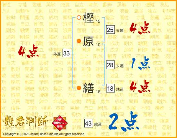 生活面を象徴する運勢です。外部から受ける影響力を表し、結婚運、家庭運や職場、環境への順応性を表します。総運から人運を引いた画数。姓や名が1文字の場合を除く。