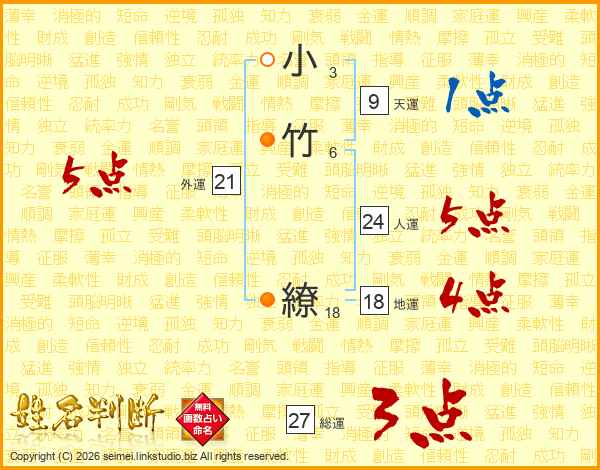 小竹繚さんの総運は27画の3点!