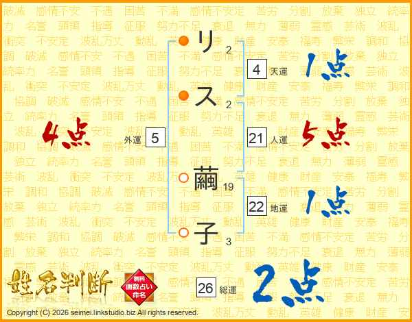 リ(2画)ス(2画) 繭(19画)子(3画)