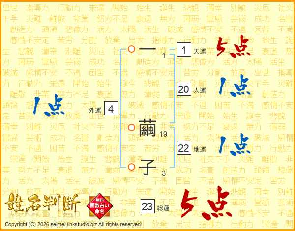生活面を象徴する運勢です。外部から受ける影響力を表し、結婚運、家庭運や職場、環境への順応性を表します。総運から人運を引いた画数。姓や名が1文字の場合を除く。