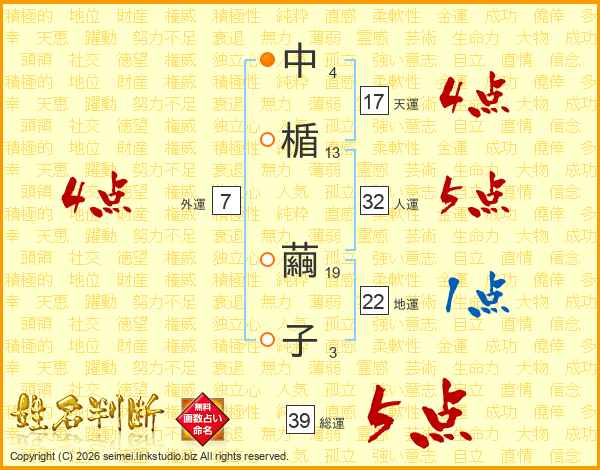 生活面を象徴する運勢です。外部から受ける影響力を表し、結婚運、家庭運や職場、環境への順応性を表します。総運から人運を引いた画数。姓や名が1文字の場合を除く。
