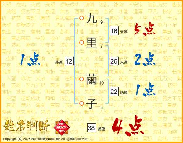 九里繭子さんの総運は38画の4点!