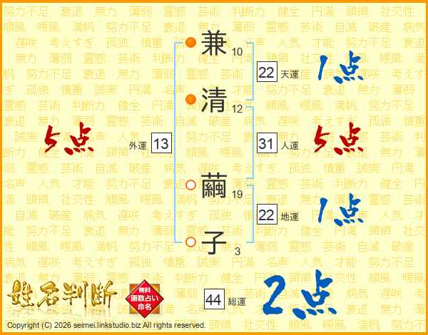 兼清繭子さんの総運は44画の2点!