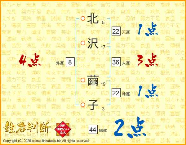生活面を象徴する運勢です。外部から受ける影響力を表し、結婚運、家庭運や職場、環境への順応性を表します。総運から人運を引いた画数。姓や名が1文字の場合を除く。