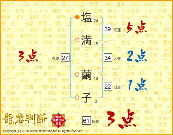 生活面を象徴する運勢です。外部から受ける影響力を表し、結婚運、家庭運や職場、環境への順応性を表します。総運から人運を引いた画数。姓や名が1文字の場合を除く。