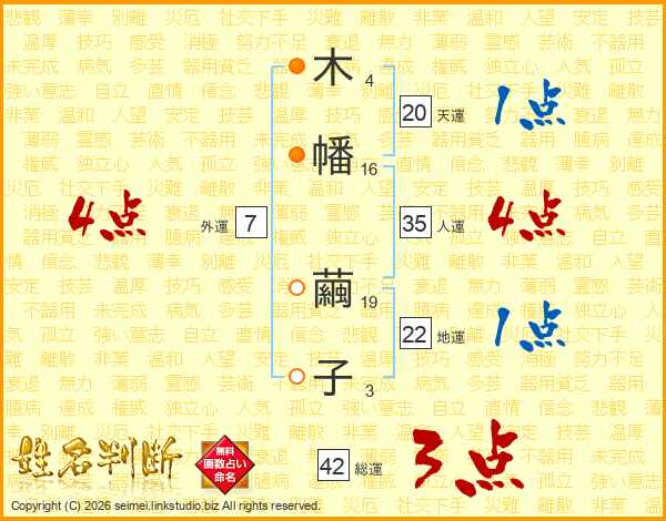 生活面を象徴する運勢です。外部から受ける影響力を表し、結婚運、家庭運や職場、環境への順応性を表します。総運から人運を引いた画数。姓や名が1文字の場合を除く。