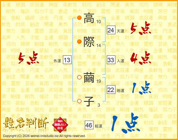生活面を象徴する運勢です。外部から受ける影響力を表し、結婚運、家庭運や職場、環境への順応性を表します。総運から人運を引いた画数。姓や名が1文字の場合を除く。