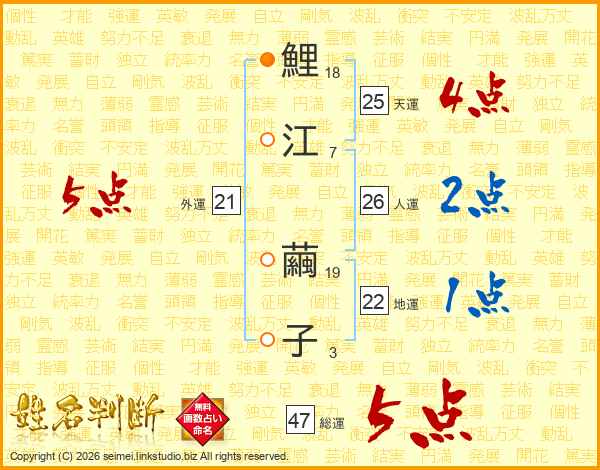 鯉(18画)江(7画) 繭(19画)子(3画)