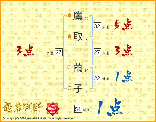 鷹(24画)取(8画) 繭(19画)子(3画)