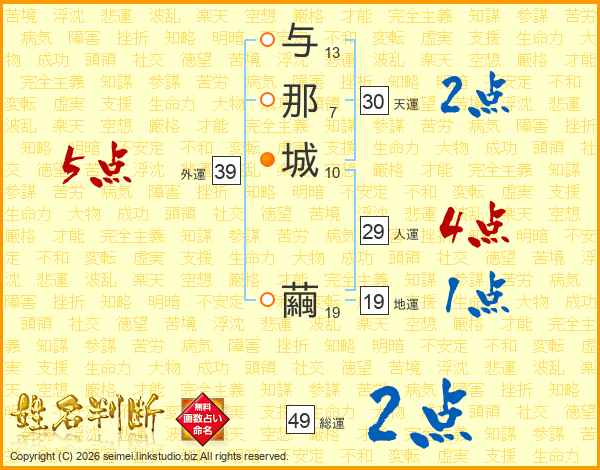 生活面を象徴する運勢です。外部から受ける影響力を表し、結婚運、家庭運や職場、環境への順応性を表します。総運から人運を引いた画数。姓や名が1文字の場合を除く。