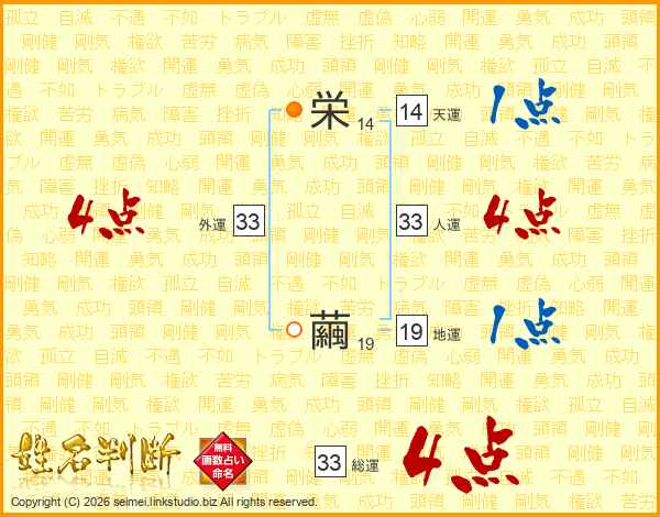生活面を象徴する運勢です。外部から受ける影響力を表し、結婚運、家庭運や職場、環境への順応性を表します。総運から人運を引いた画数。姓や名が1文字の場合を除く。