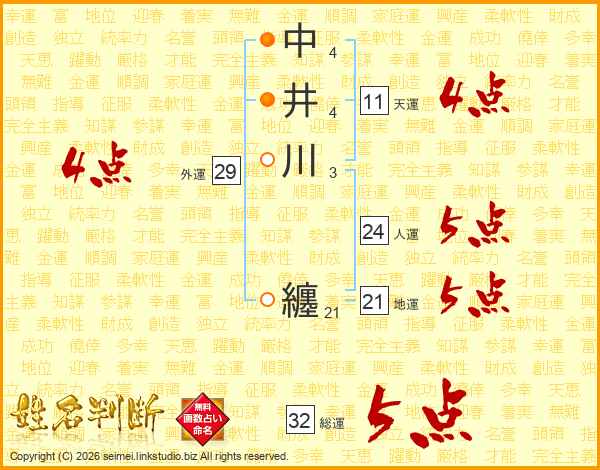 生活面を象徴する運勢です。外部から受ける影響力を表し、結婚運、家庭運や職場、環境への順応性を表します。総運から人運を引いた画数。姓や名が1文字の場合を除く。
