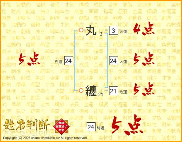 あなたの人生を表す1番重要な運勢です。生涯を通じて影響する総合運となり、主に50歳以降の晩年期に影響を及ぼします。苗字と名前の合計画数。