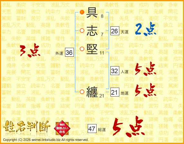 あなたの人生を表す1番重要な運勢です。生涯を通じて影響する総合運となり、主に50歳以降の晩年期に影響を及ぼします。苗字と名前の合計画数。