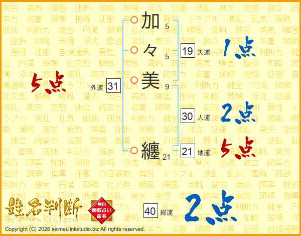 加(5画)々(5画)美(9画) 纏(21画)