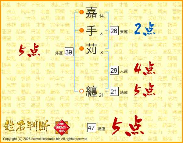 嘉(14画)手(4画)苅(8画) 纏(21画)