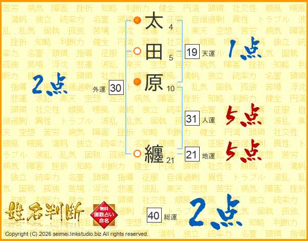 生活面を象徴する運勢です。外部から受ける影響力を表し、結婚運、家庭運や職場、環境への順応性を表します。総運から人運を引いた画数。姓や名が1文字の場合を除く。