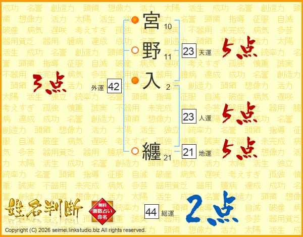 生活面を象徴する運勢です。外部から受ける影響力を表し、結婚運、家庭運や職場、環境への順応性を表します。総運から人運を引いた画数。姓や名が1文字の場合を除く。