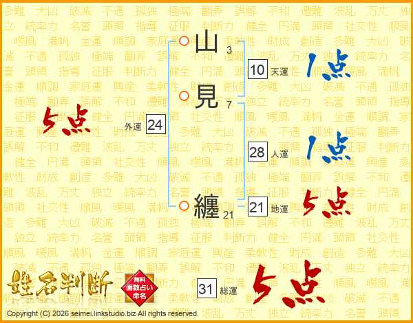 生活面を象徴する運勢です。外部から受ける影響力を表し、結婚運、家庭運や職場、環境への順応性を表します。総運から人運を引いた画数。姓や名が1文字の場合を除く。