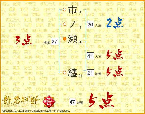 市(5画)ノ(1画)瀬(20画) 纏(21画)