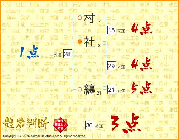 生活面を象徴する運勢です。外部から受ける影響力を表し、結婚運、家庭運や職場、環境への順応性を表します。総運から人運を引いた画数。姓や名が1文字の場合を除く。