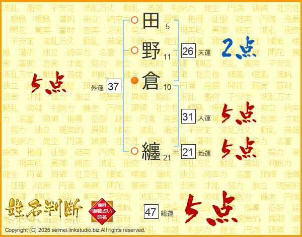 生活面を象徴する運勢です。外部から受ける影響力を表し、結婚運、家庭運や職場、環境への順応性を表します。総運から人運を引いた画数。姓や名が1文字の場合を除く。