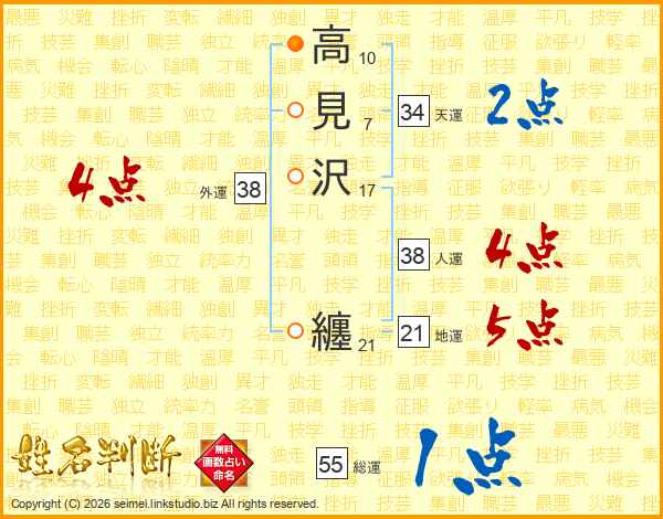 生活面を象徴する運勢です。外部から受ける影響力を表し、結婚運、家庭運や職場、環境への順応性を表します。総運から人運を引いた画数。姓や名が1文字の場合を除く。