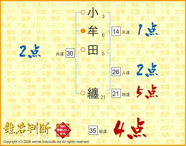 生活面を象徴する運勢です。外部から受ける影響力を表し、結婚運、家庭運や職場、環境への順応性を表します。総運から人運を引いた画数。姓や名が1文字の場合を除く。