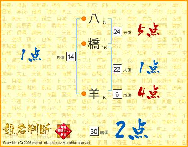 生活面を象徴する運勢です。外部から受ける影響力を表し、結婚運、家庭運や職場、環境への順応性を表します。総運から人運を引いた画数。姓や名が1文字の場合を除く。