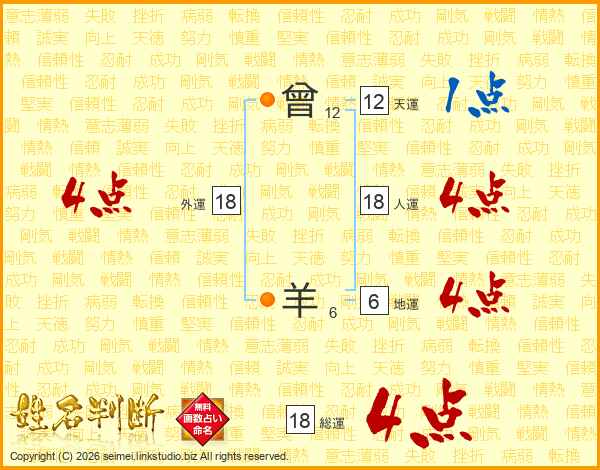 家系が持つ宿命的な運勢を表します。祖先から受け継いだ苗字ですので自分の力が及びません。家柄を象徴します。苗字の合計画数。