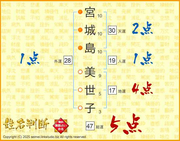 宮(10画)城(10画)島(10画) 美(9画)世(5画)子(3画)